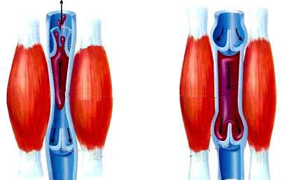 Οι φλέβες των ποδιών εξωθούν το αίμα προς την καρδιά κάθε φορά που συσπώνται οι μύες του ποδιού ενώ οι βαλβίδες αποτρέπουν την παλινδρόμηση αίματος κατά τη χάλαση των μυών (όπως συμβαίνει στην βάδιση – μυϊκή αντλία)
